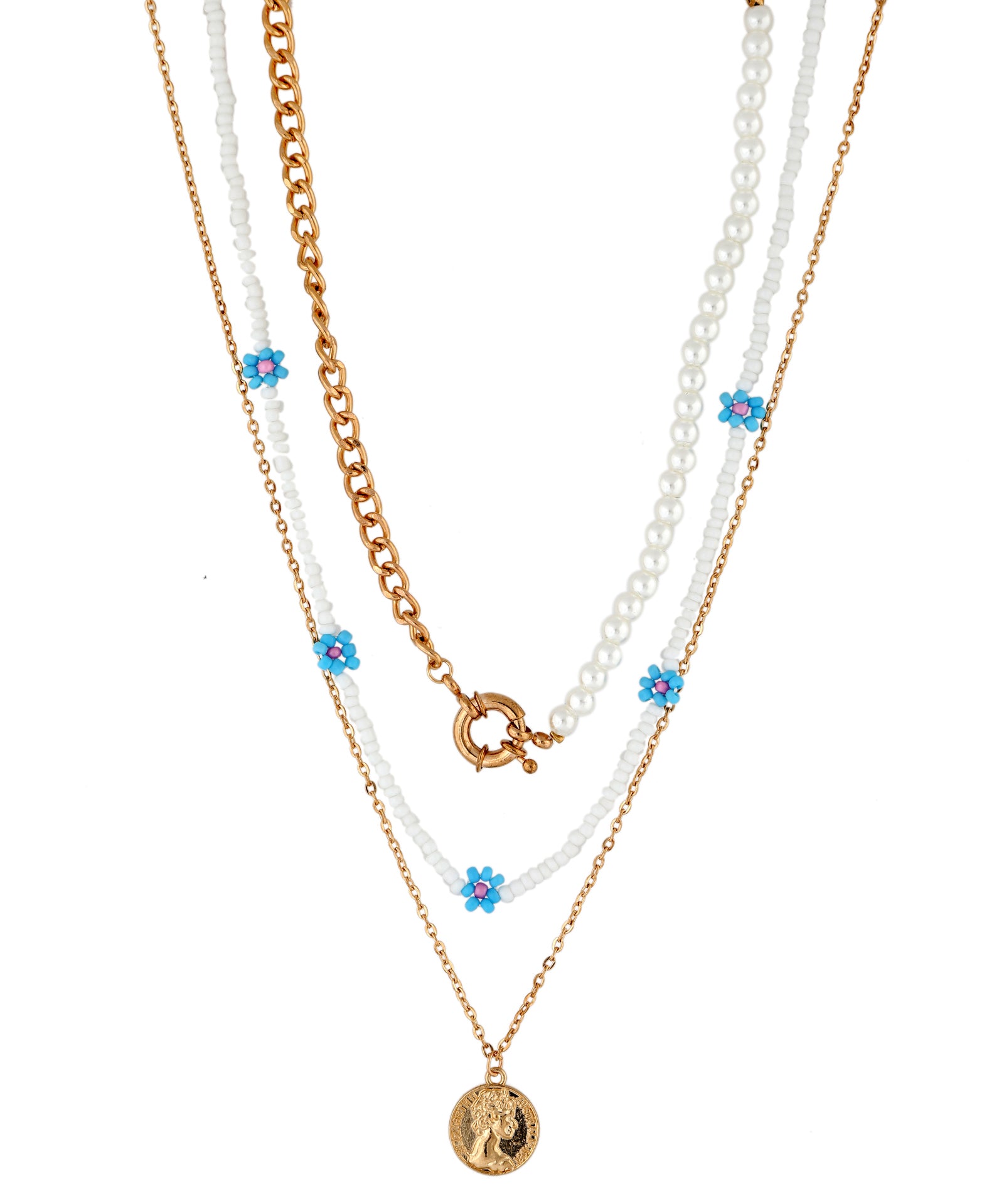 Three row necklace. Chains with different lengths in gold tones and colored stones.