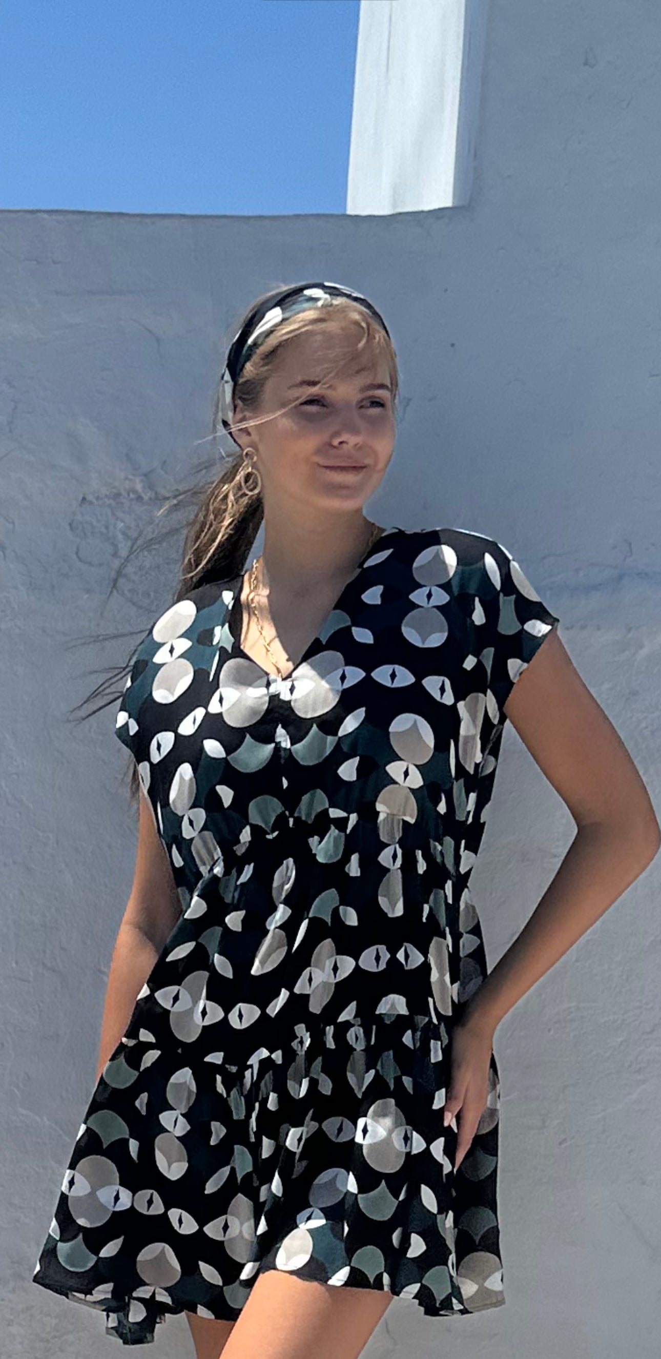 Short sleeve mini dress, with V neck. Lovely print with a geometric pattern in black, ivory and green. It is made of 100% Viscose which makes it particularly cool and light!