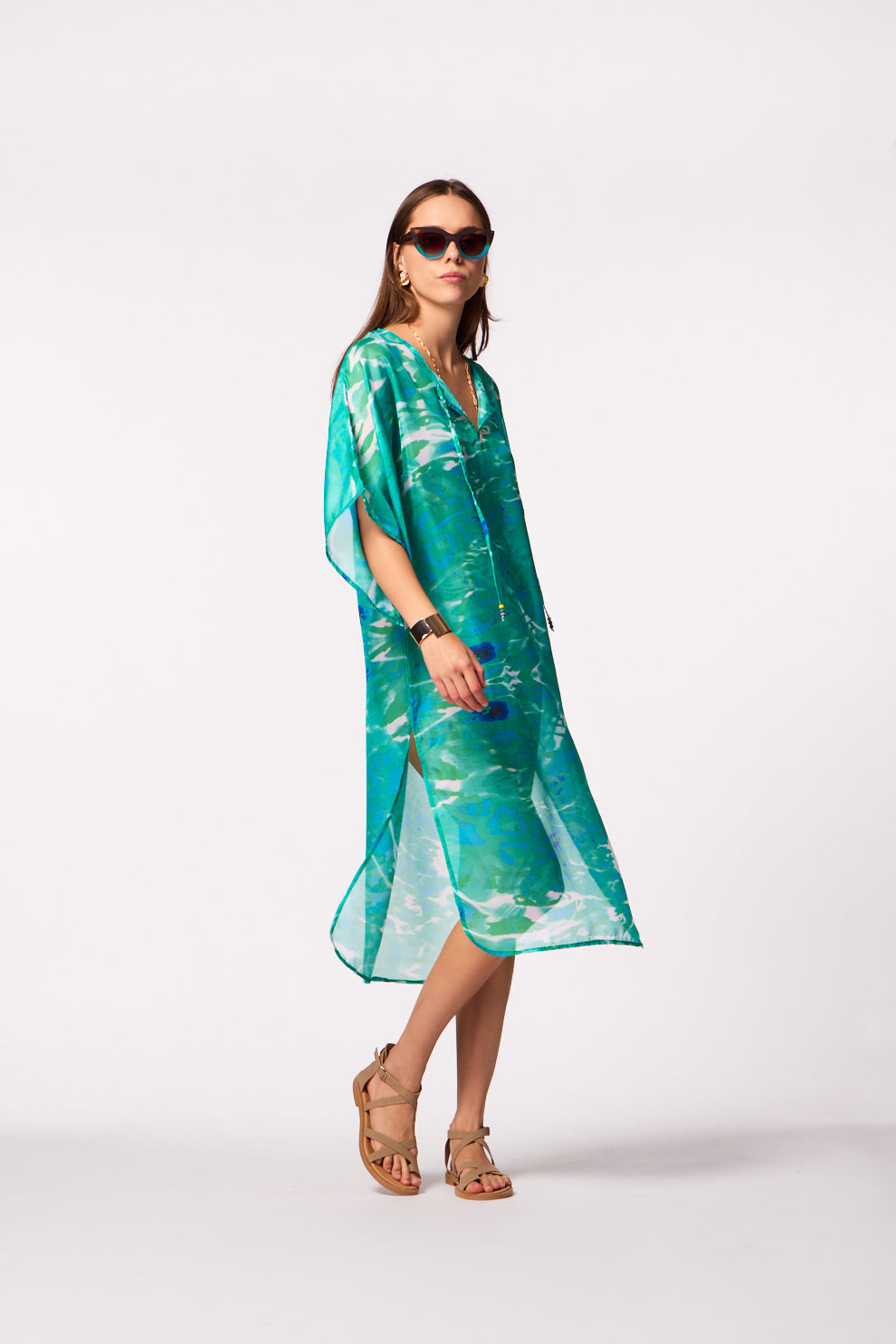 • Midi kaftan with a bold pattern for a vibrant, chic silhouette