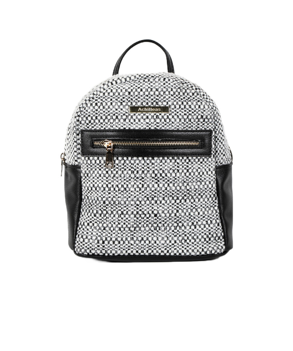 Τσάντα πλάτης με ύφανση ζακάρ. Εξωτερική τσέπη και κλείσιμο με φερμουάρ.