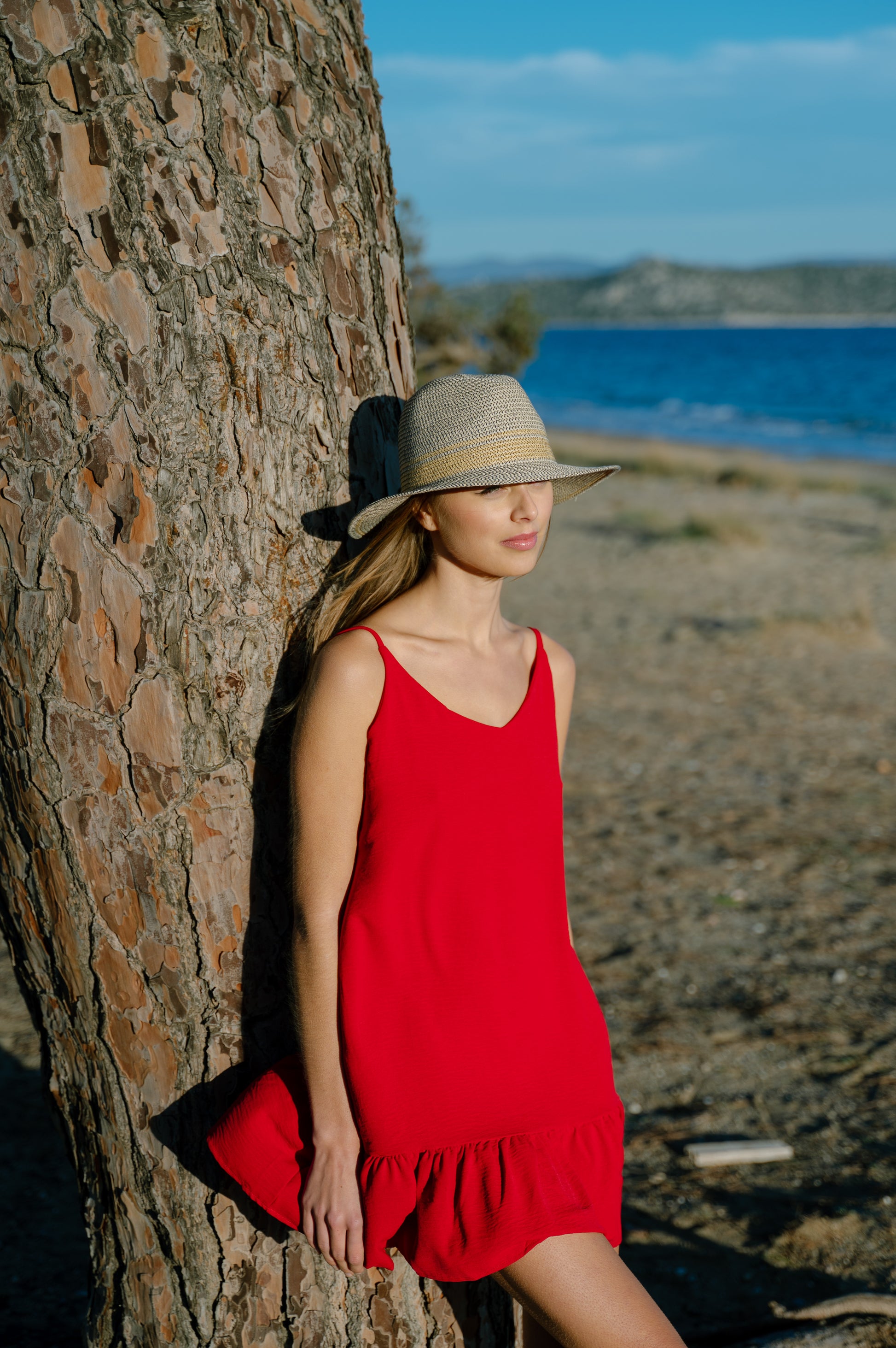 Ψάθινο καπέλο με ρίγα σε φυσική απόχρωση για chic εμφανίσεις.