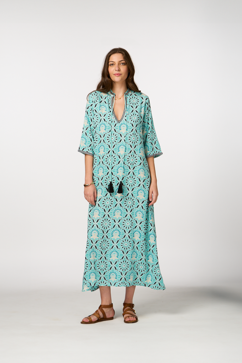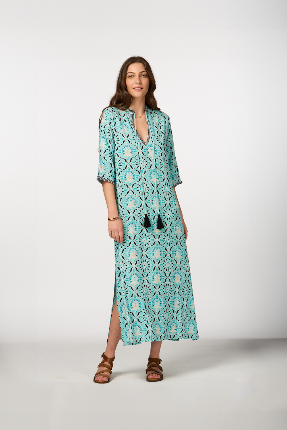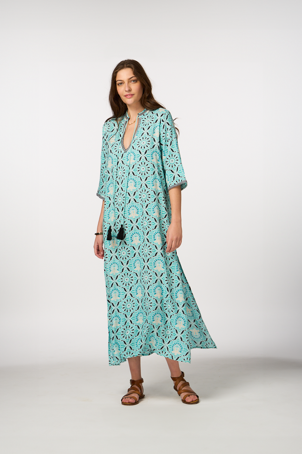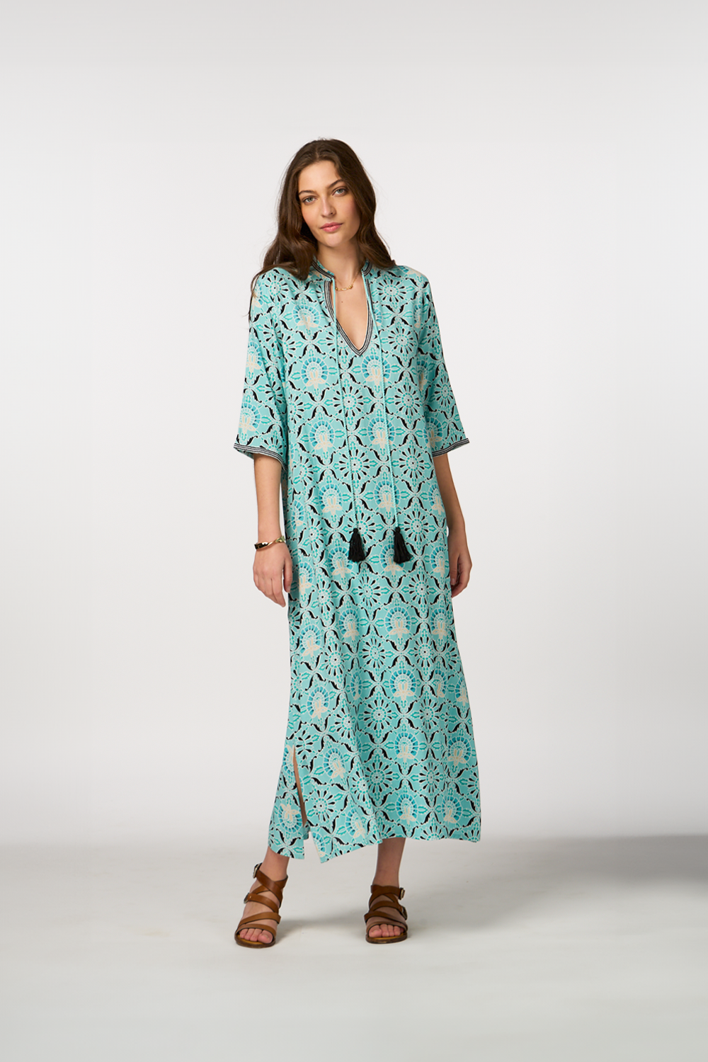 - Long-sleeve dress with cord details and tassels for a boho chic vibe