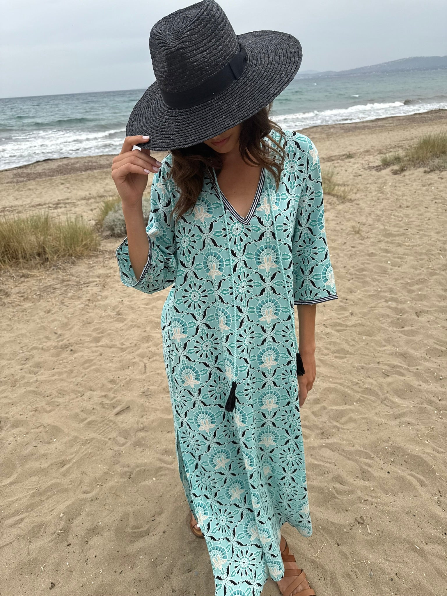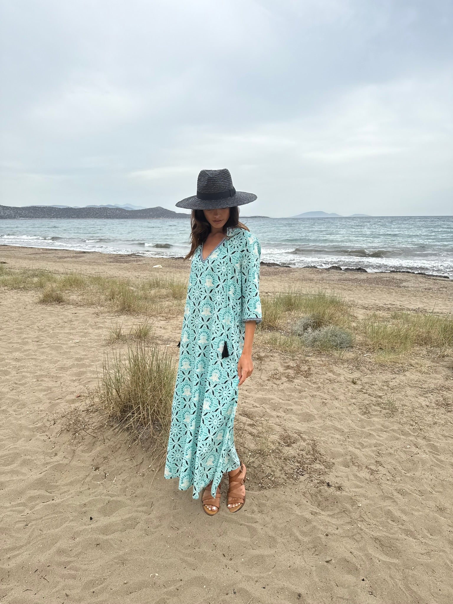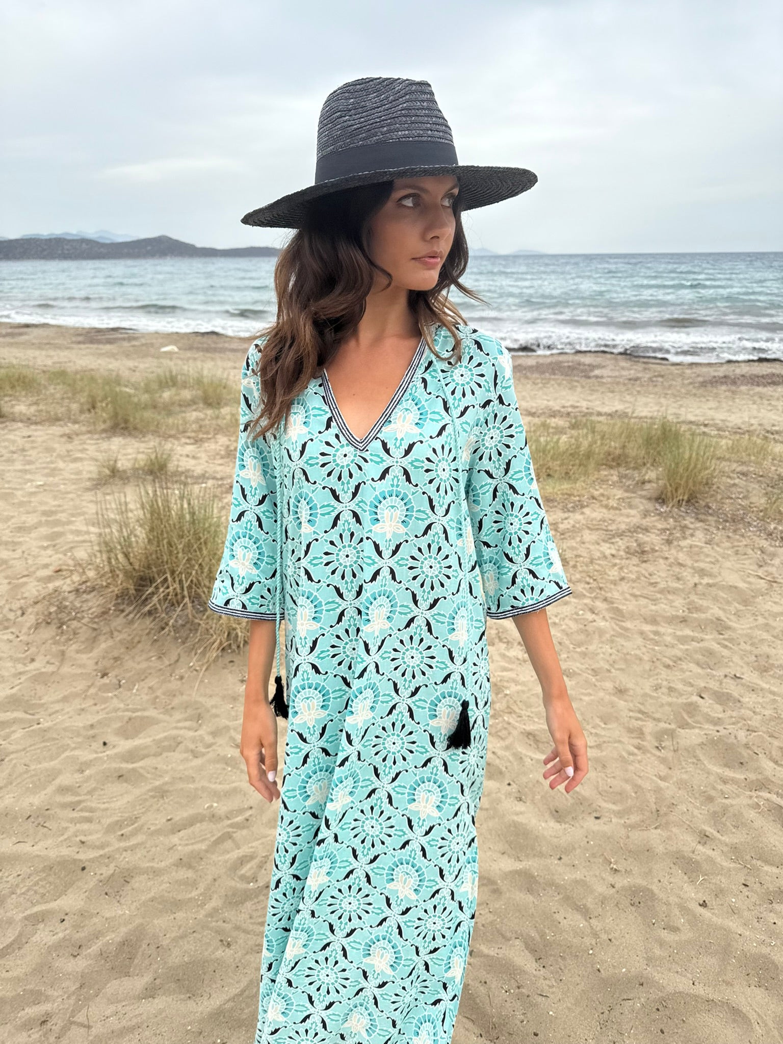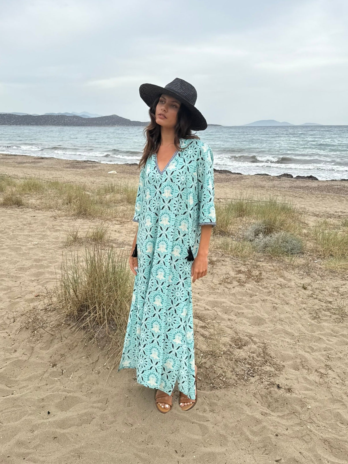 - Long-sleeve dress with cord details and tassels for a boho chic vibe