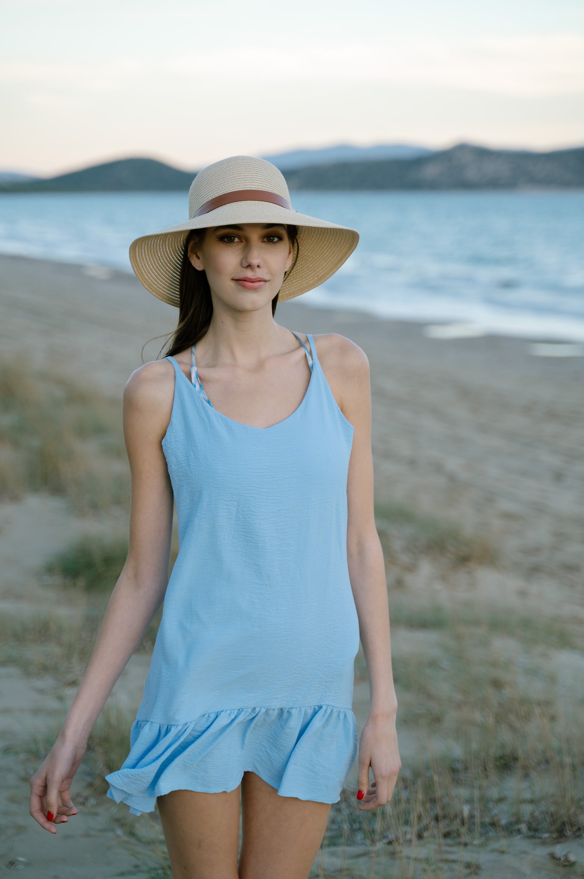 - Short, airy light blue dress with straps and ruffled hem for a playful, feminine look