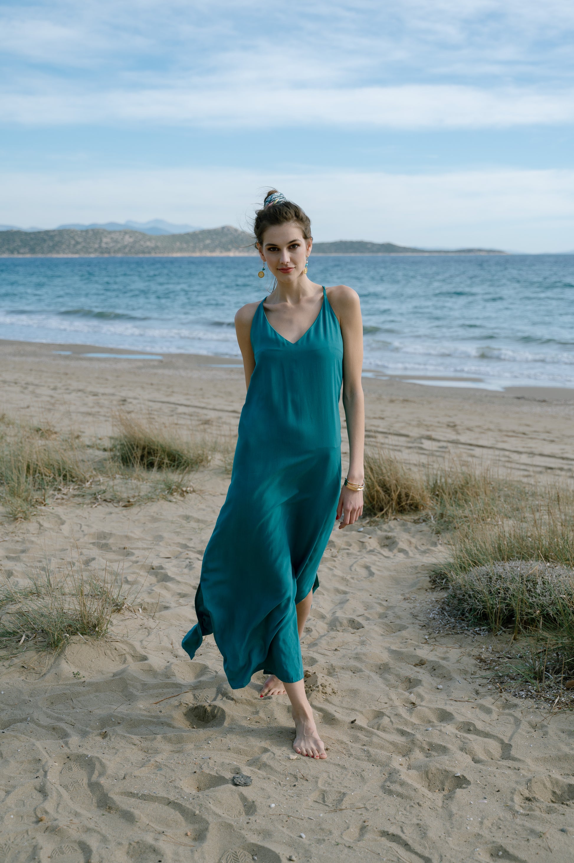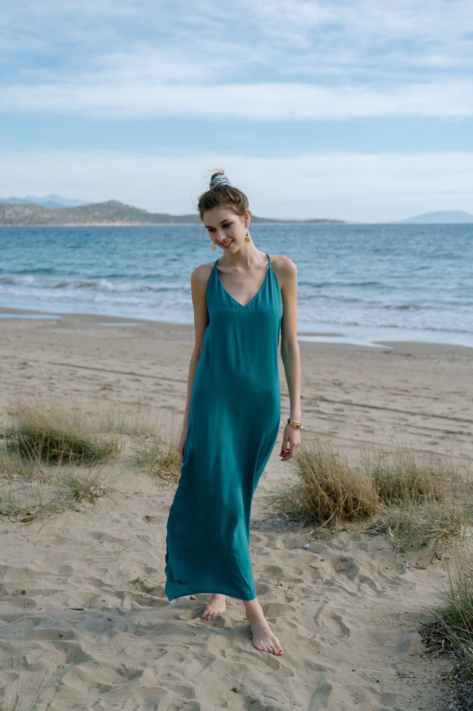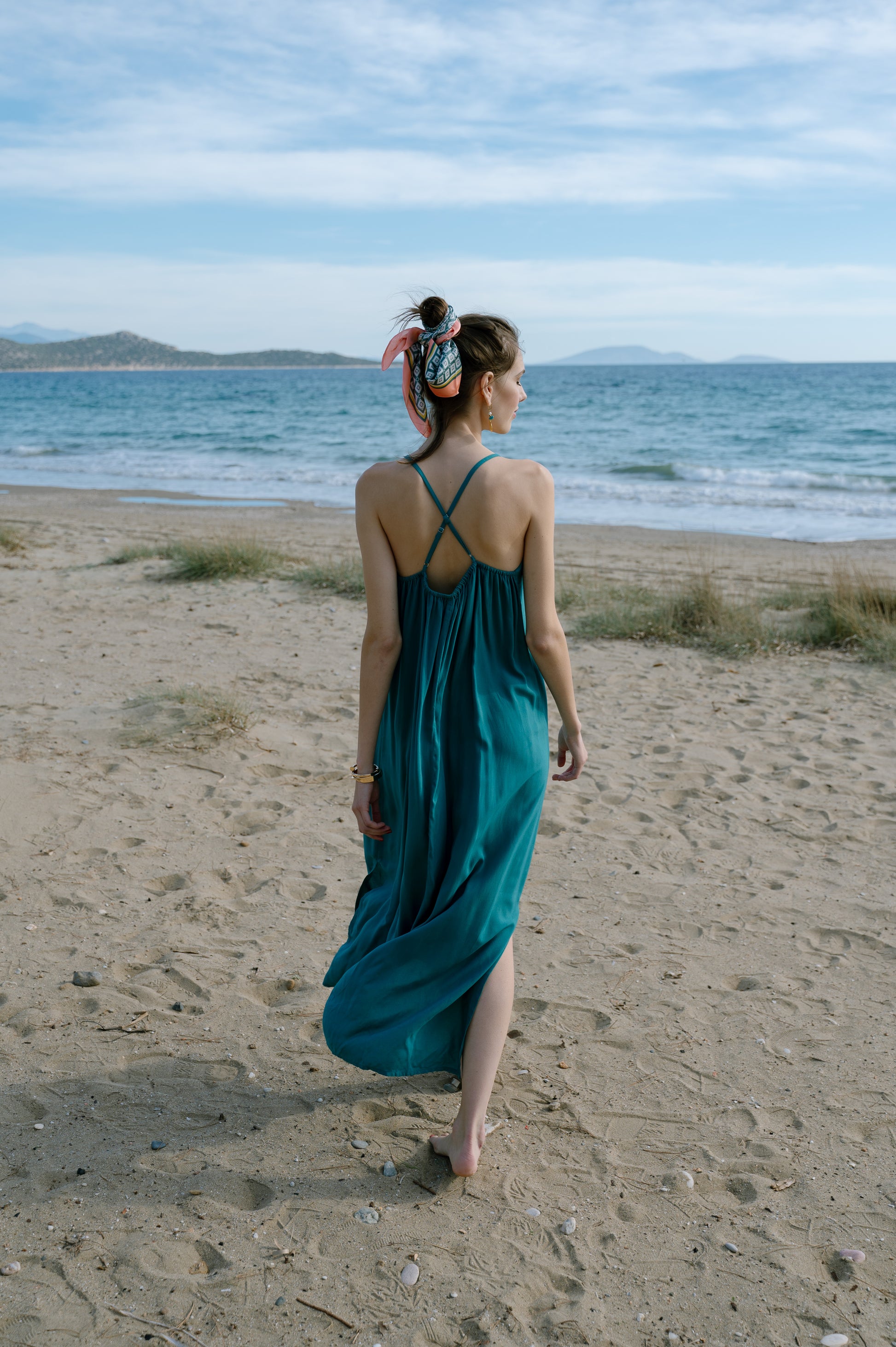 - Maxi airy, solid-colored dress with a crisscross tie at the back for a unique touch