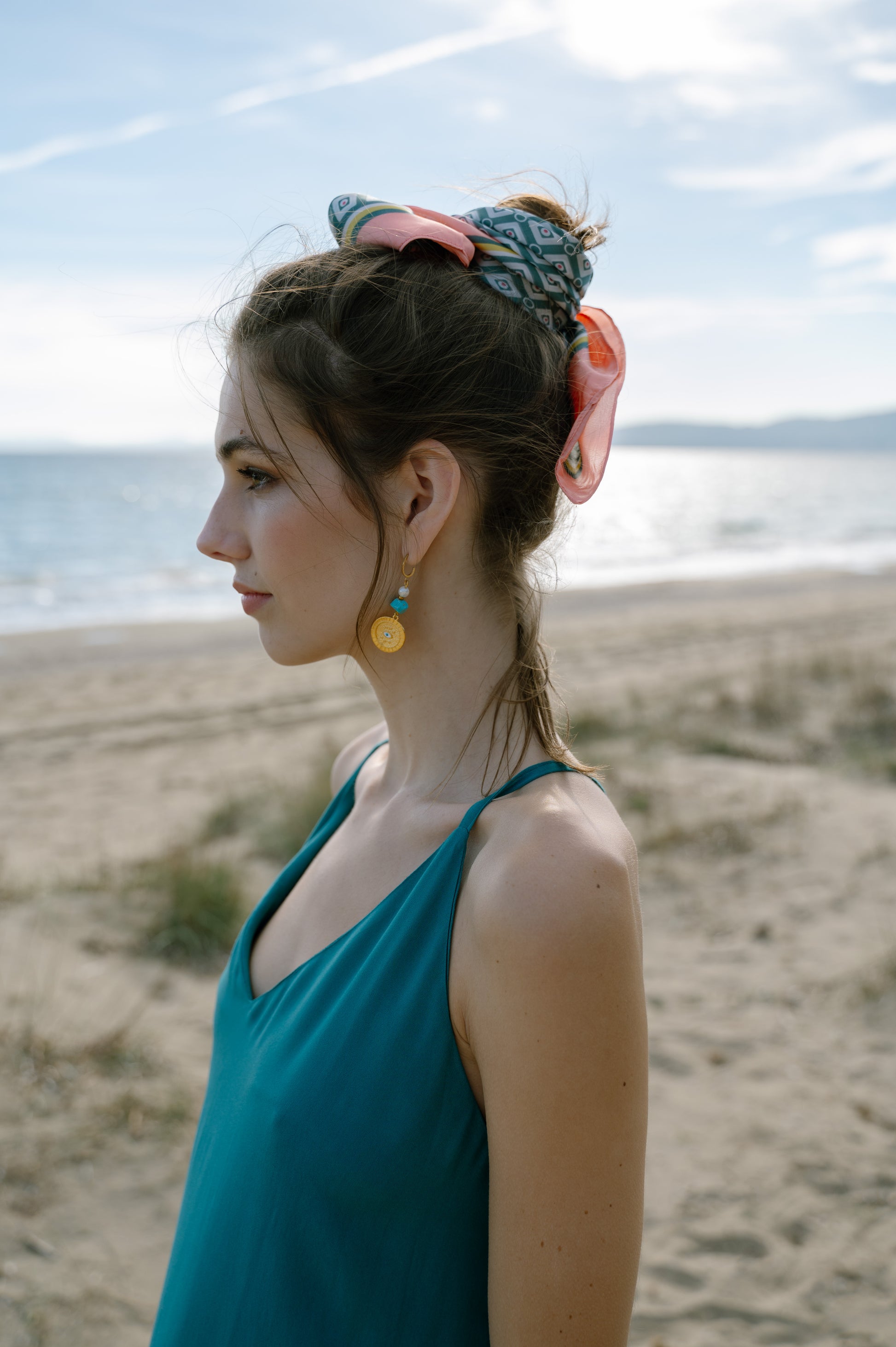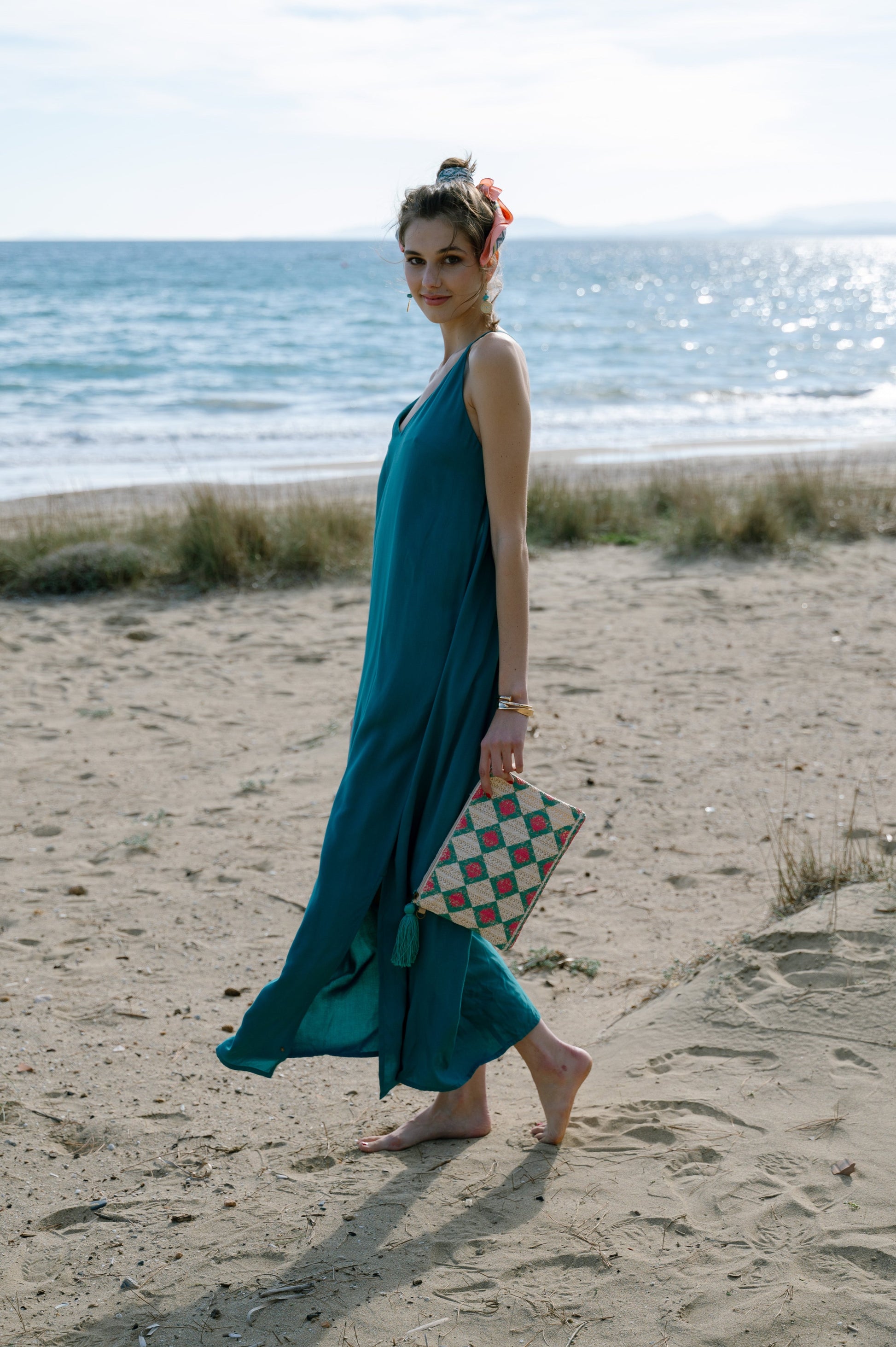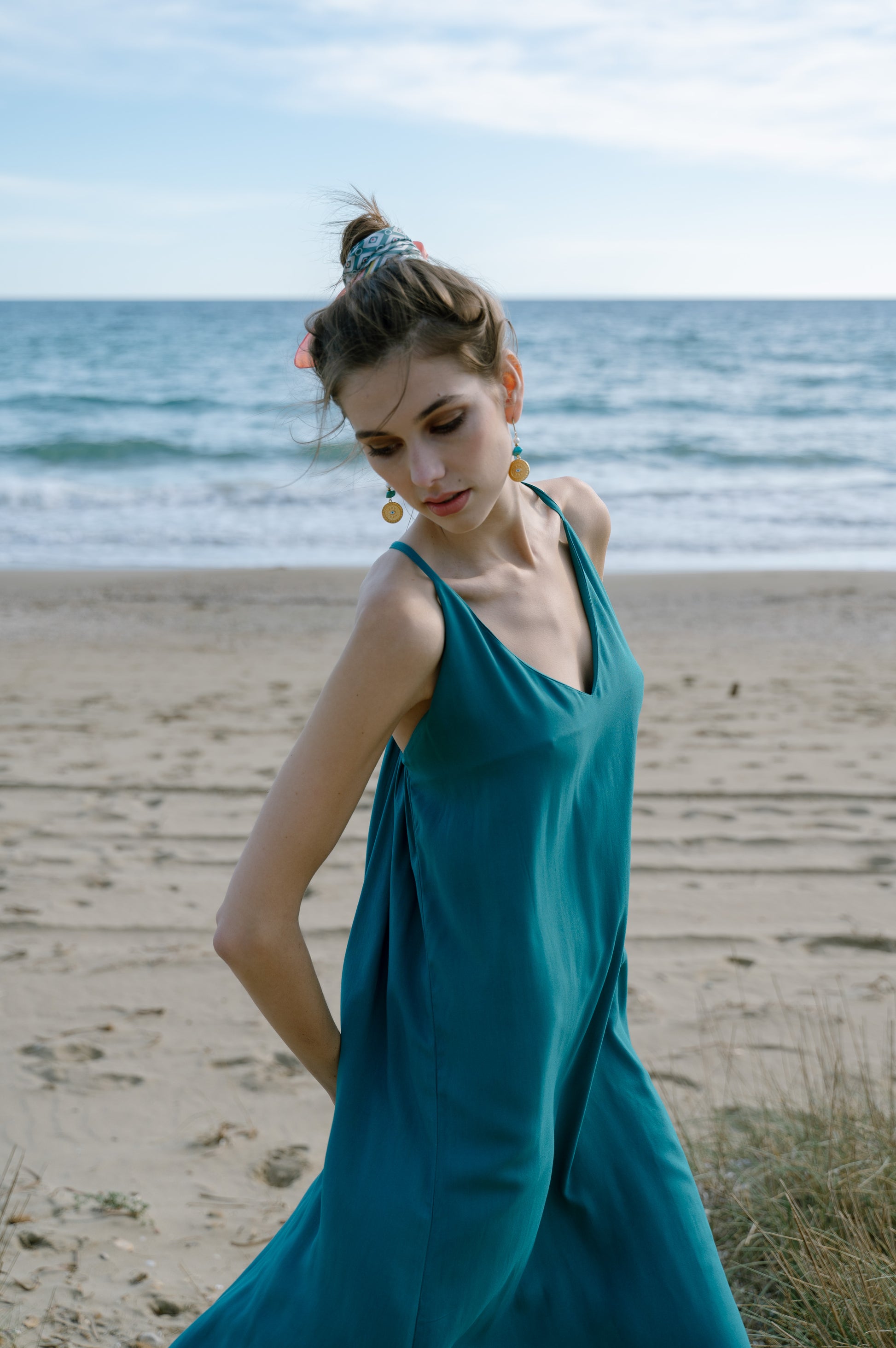- Maxi airy, solid-colored dress with a crisscross tie at the back for a unique touch