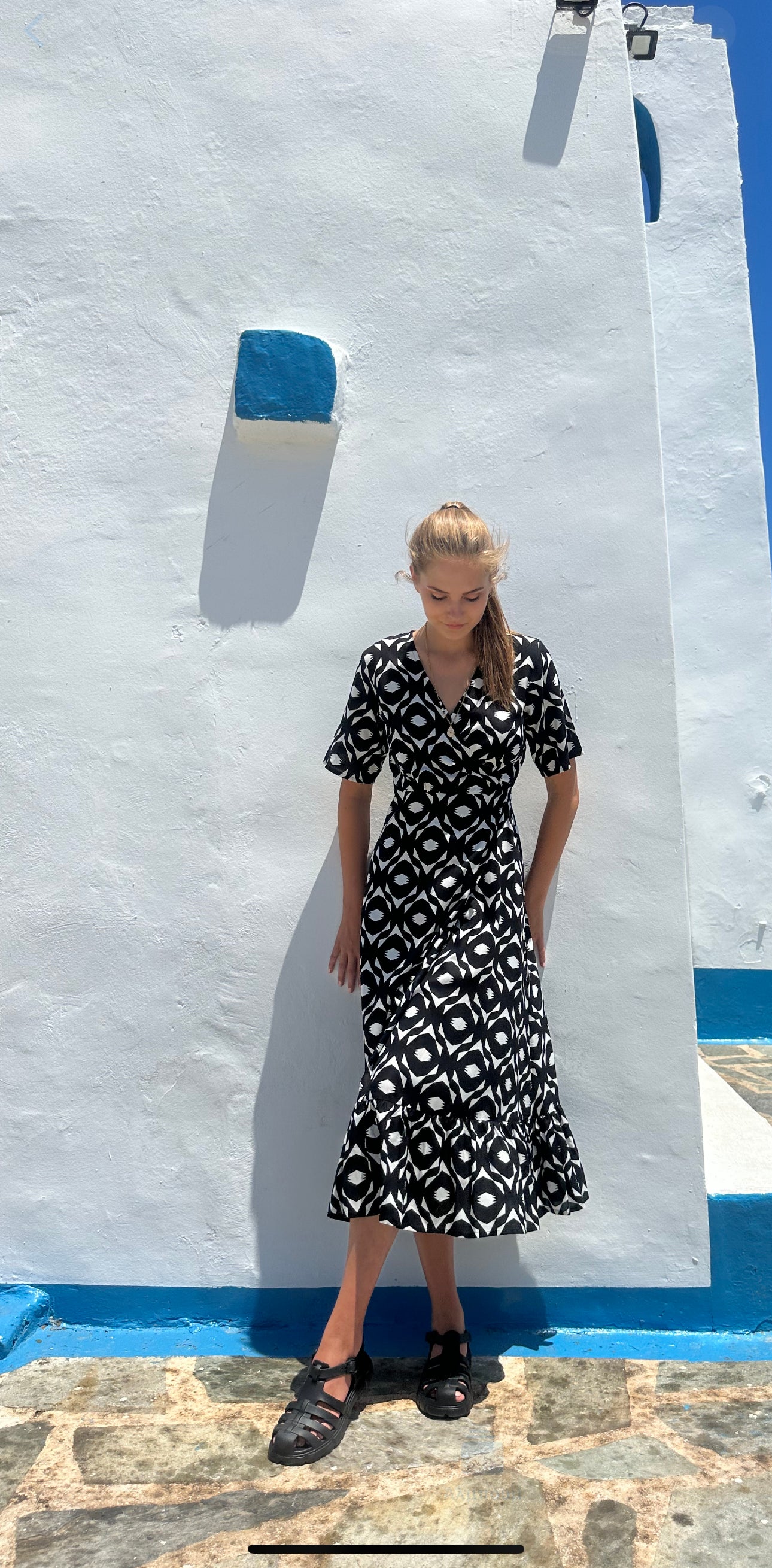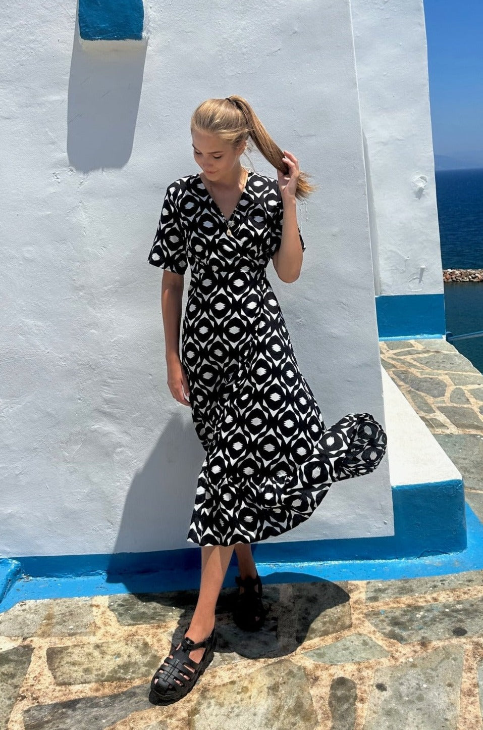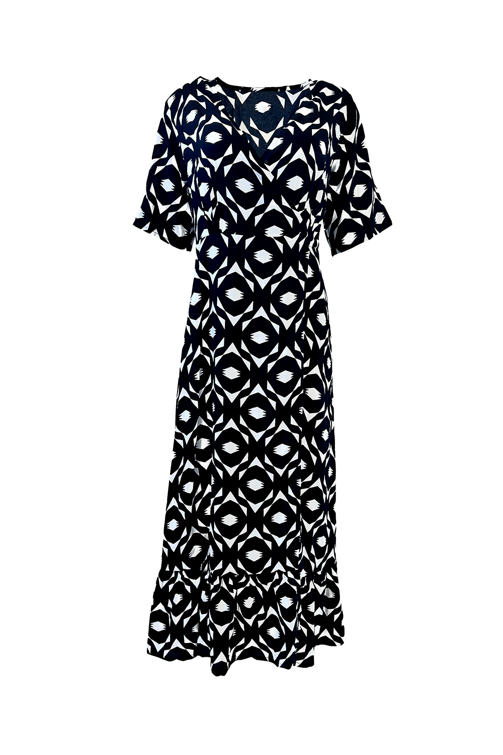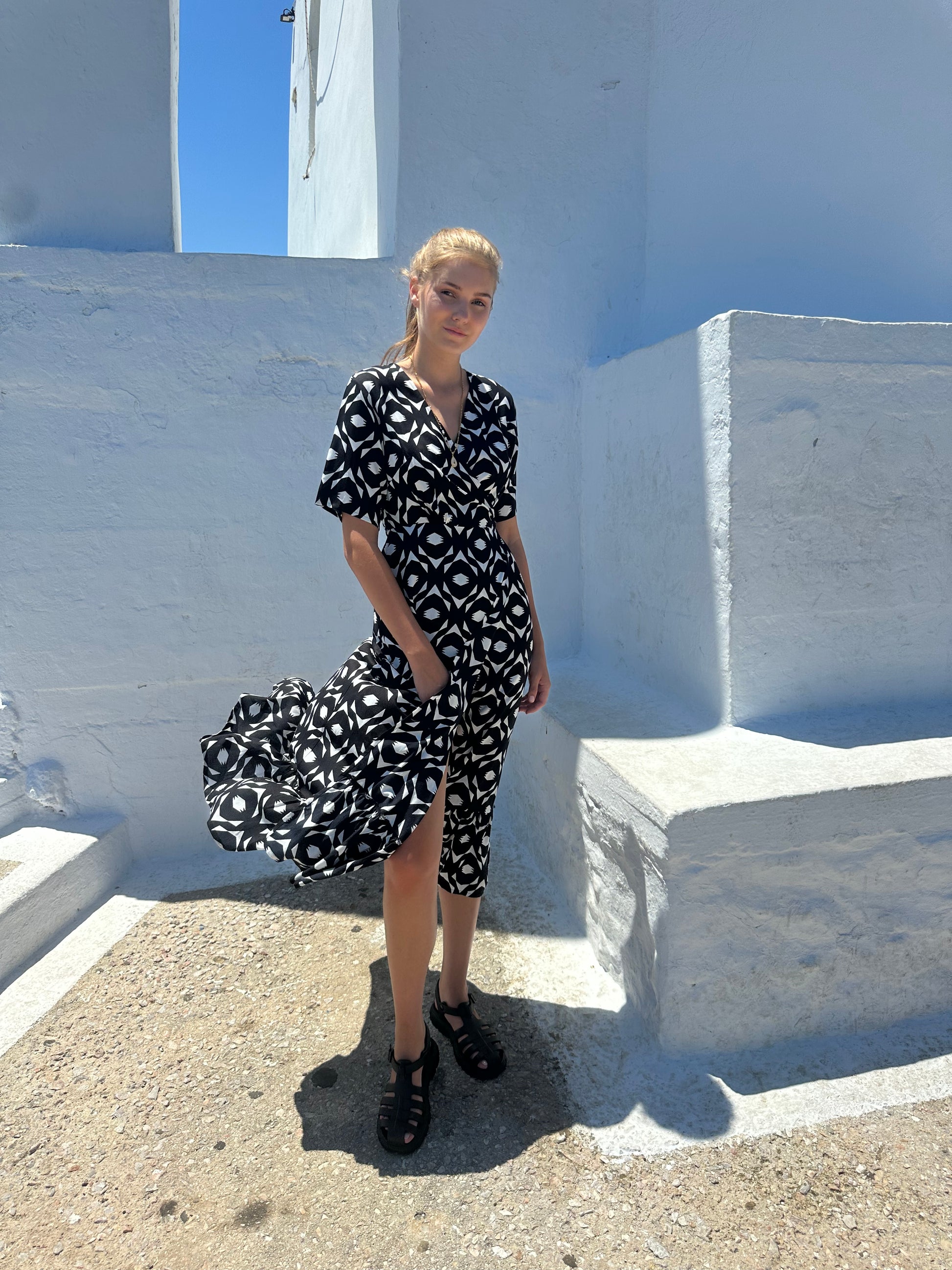 • Maxi with a geometric print in black for a bold, modern look