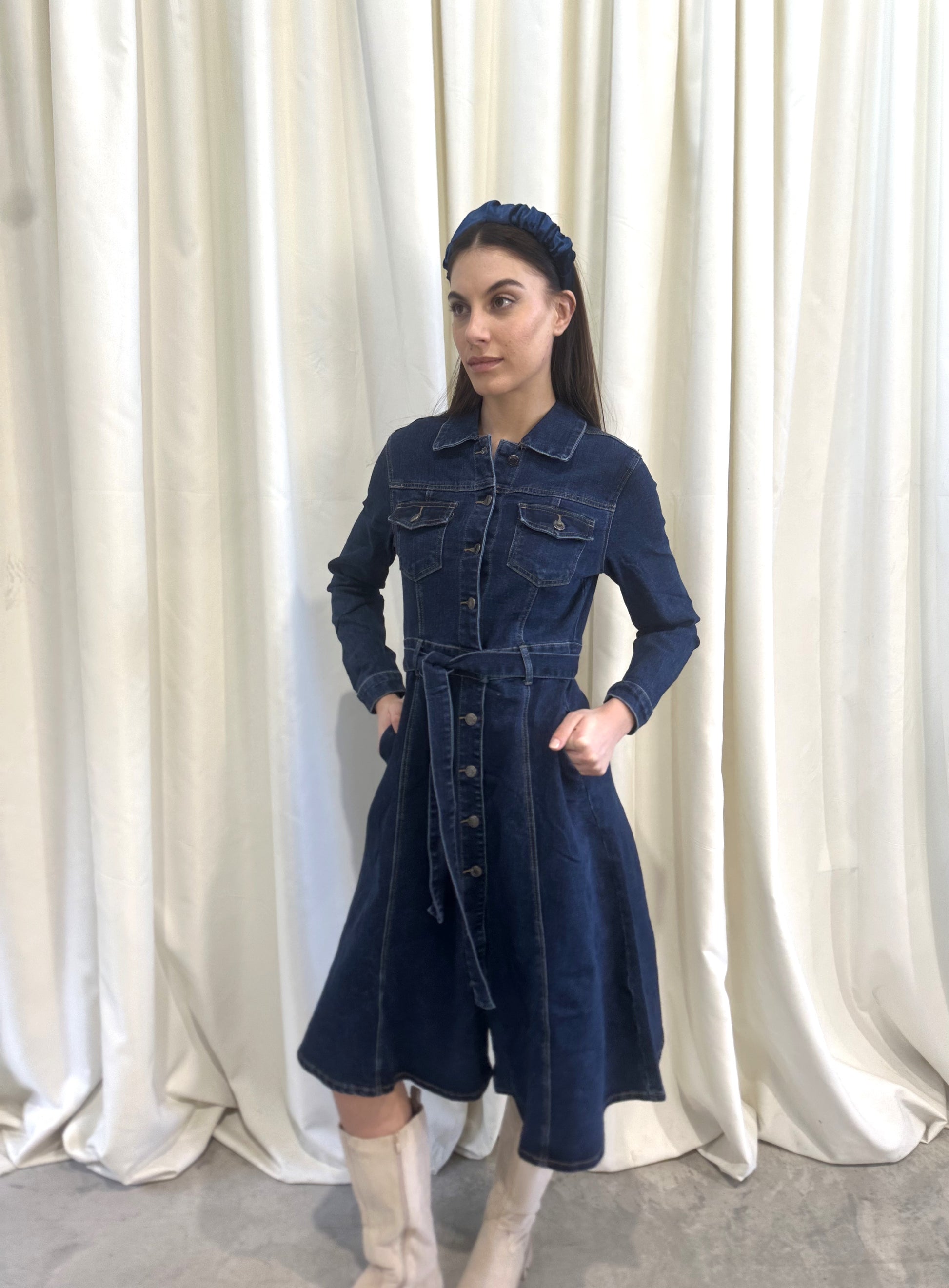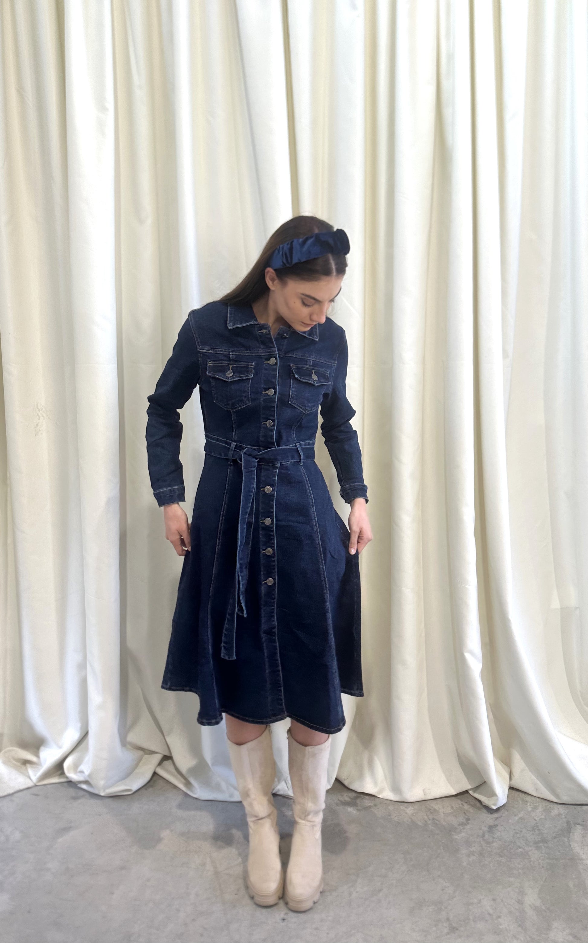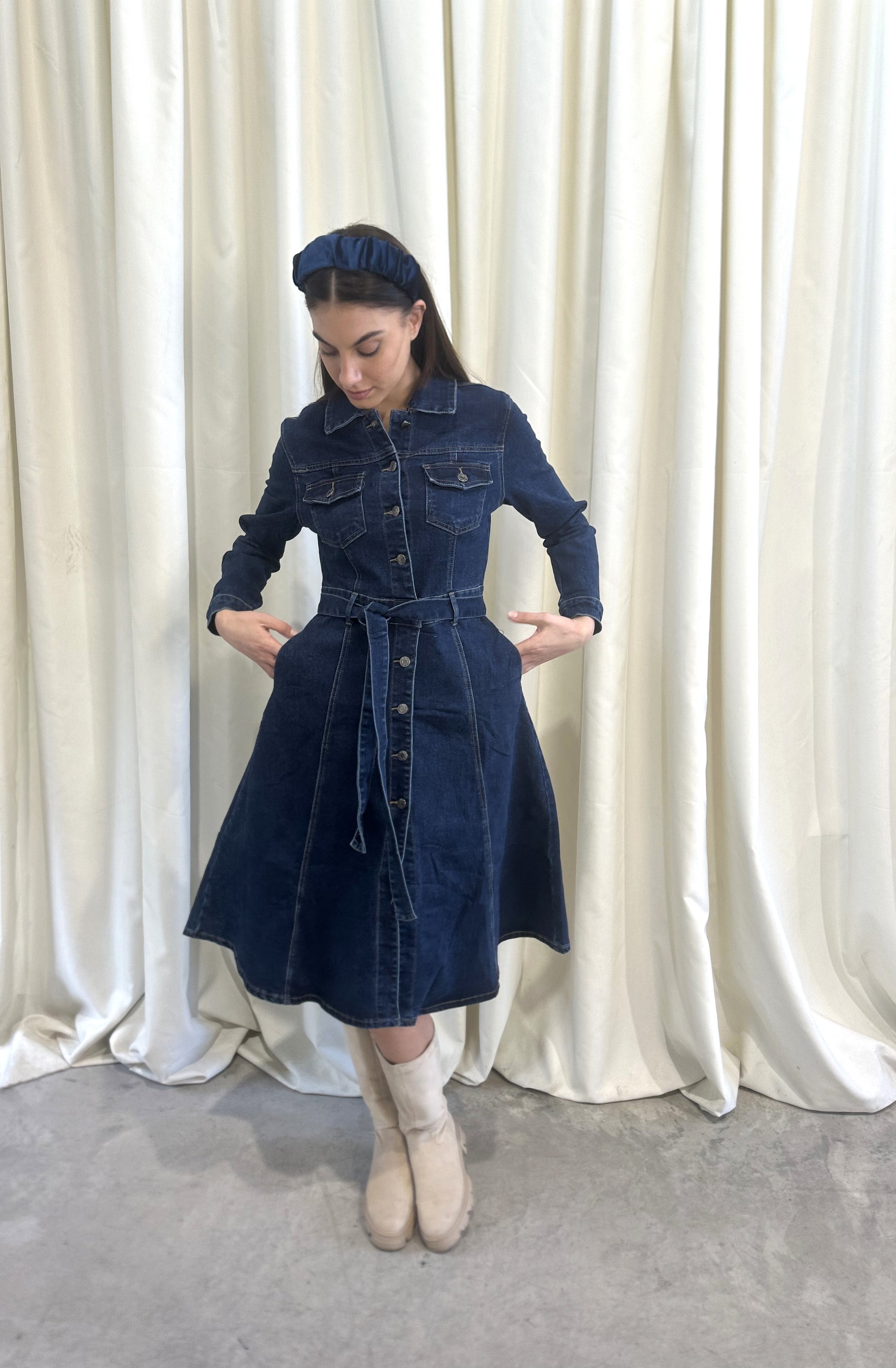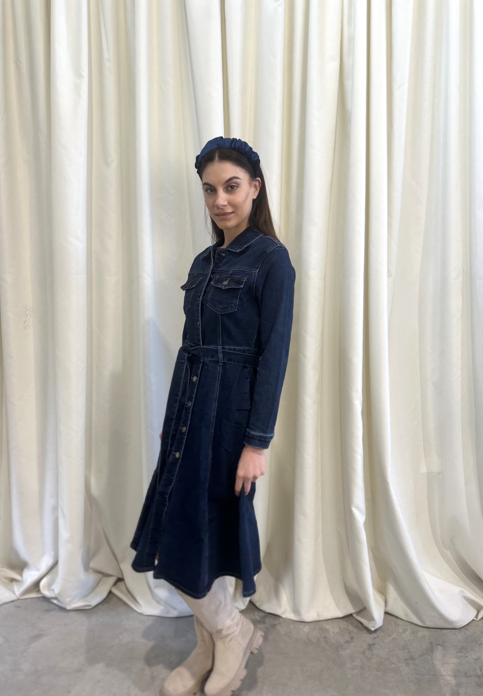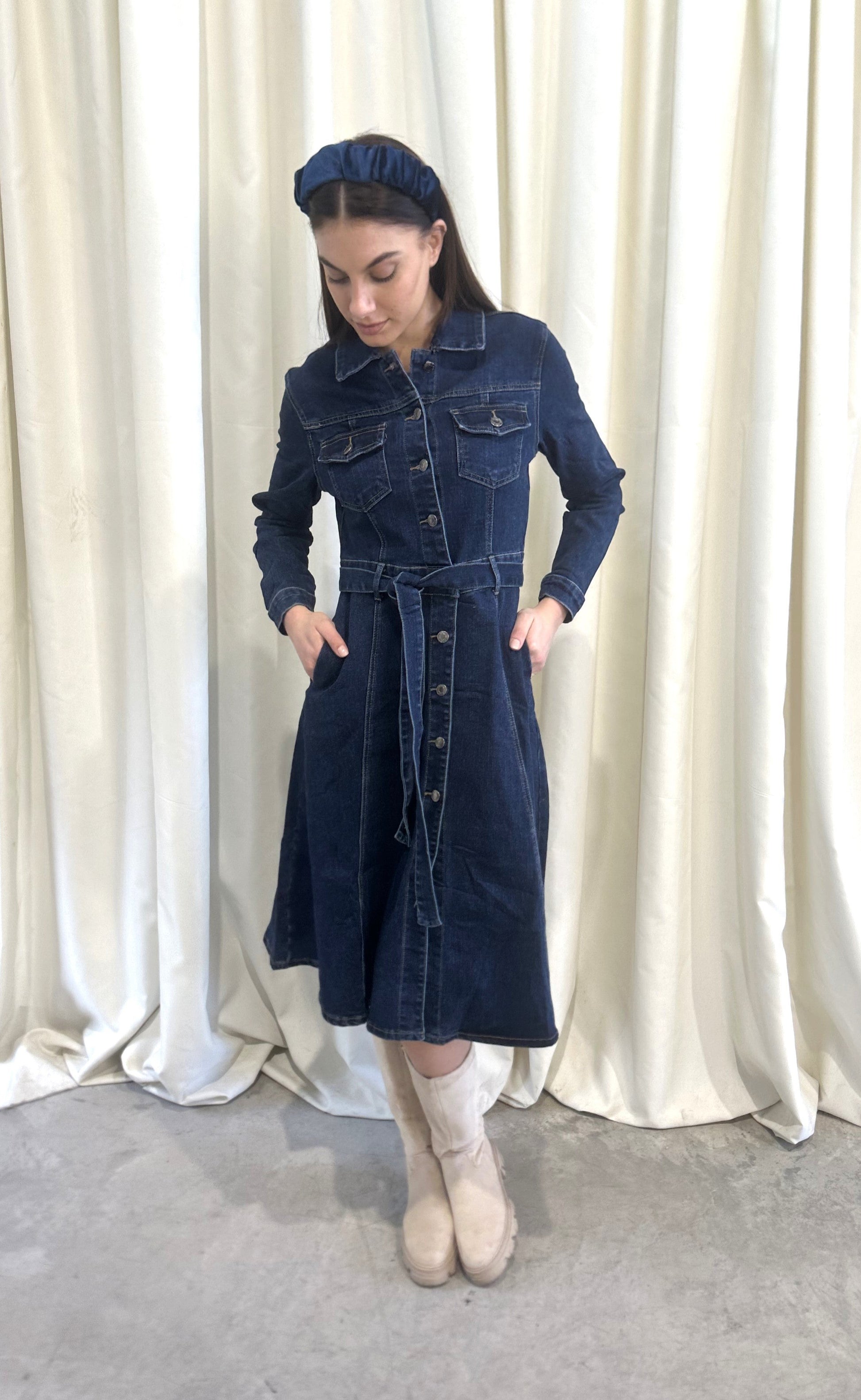 Jean φόρεμα με κουμπιά και ζώνη στη μέση. Εύκολο και άνετο look απο το πρωί εώς το βράδυ.