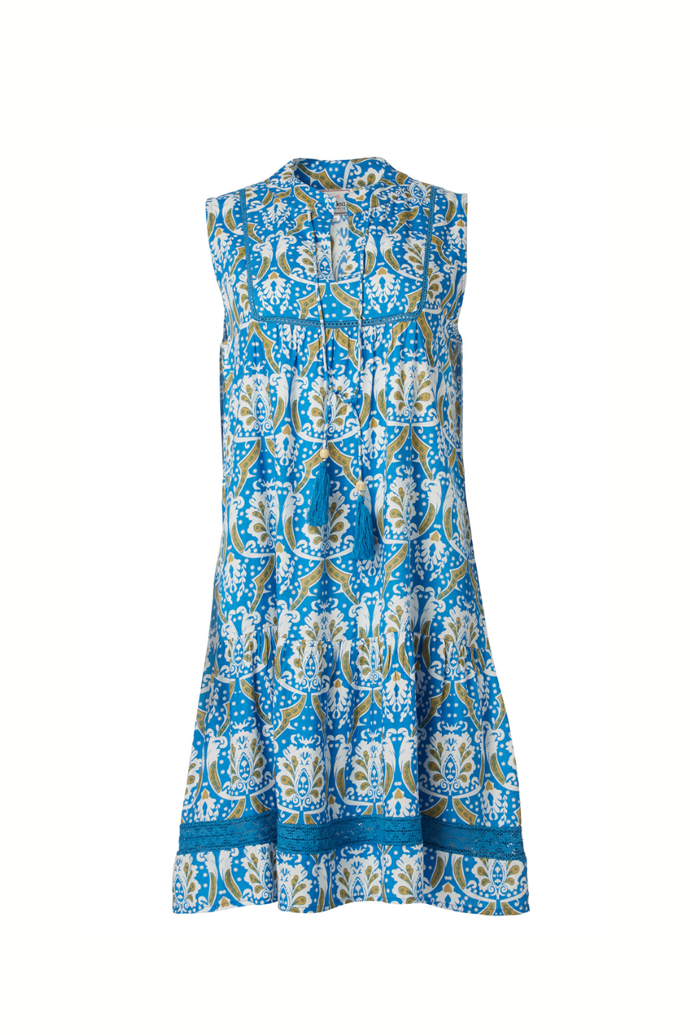 - Mini dress without sleeves in blue shades with a unique, eye-catching print