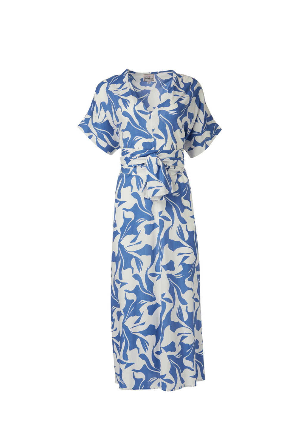 - Midi dress with a blue and white floral print for a timeless, sophisticated look