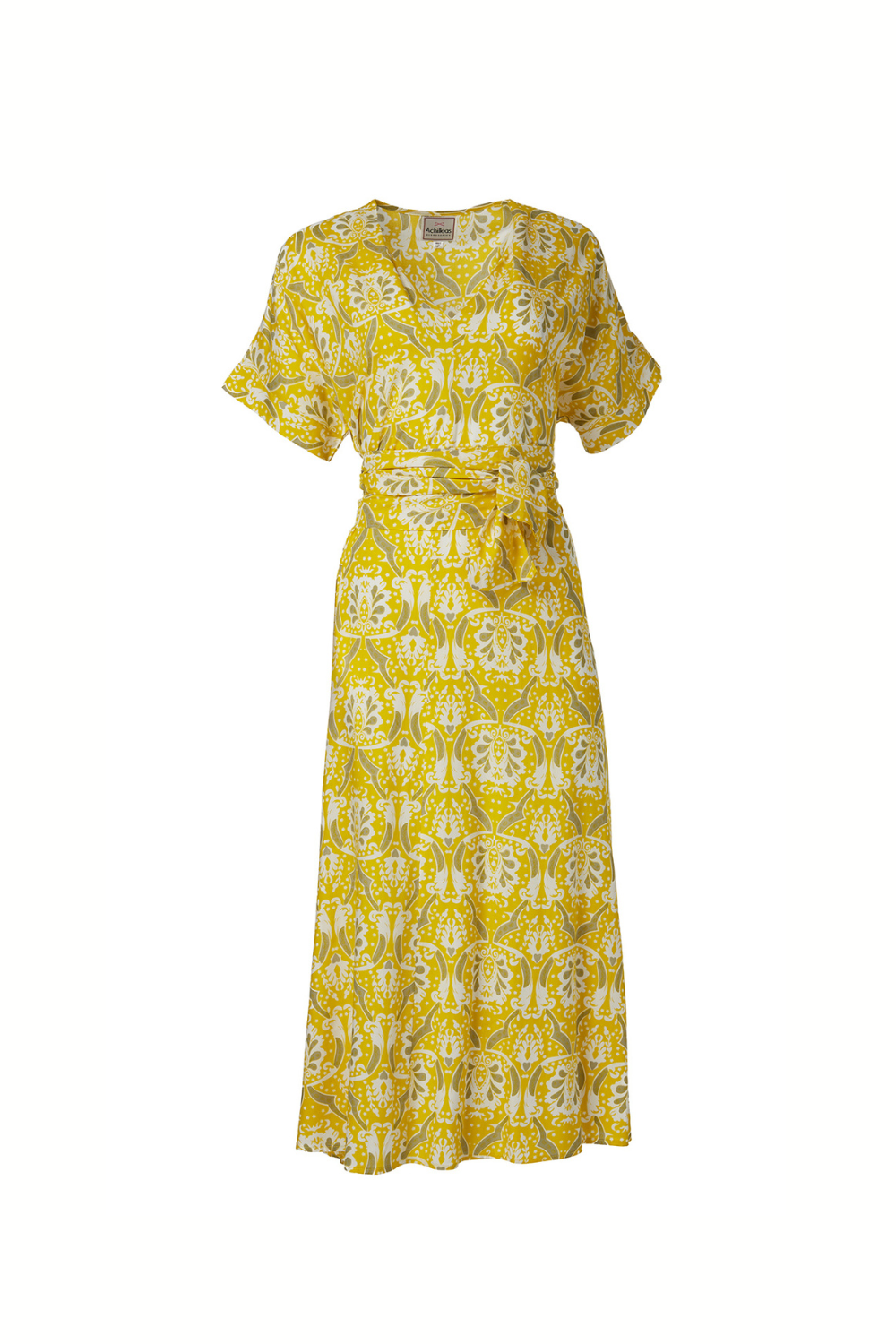 - Midi dress with yellow paisley print for a timeless, sophisticated look