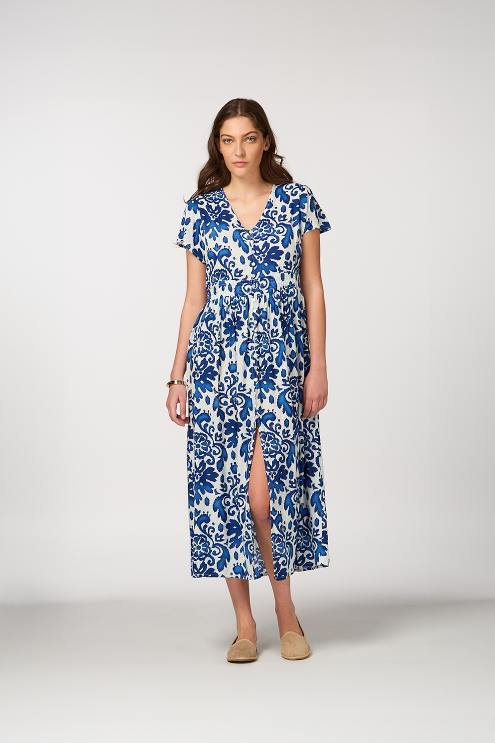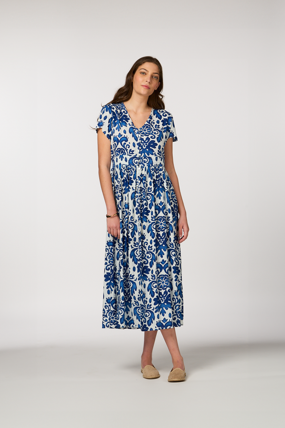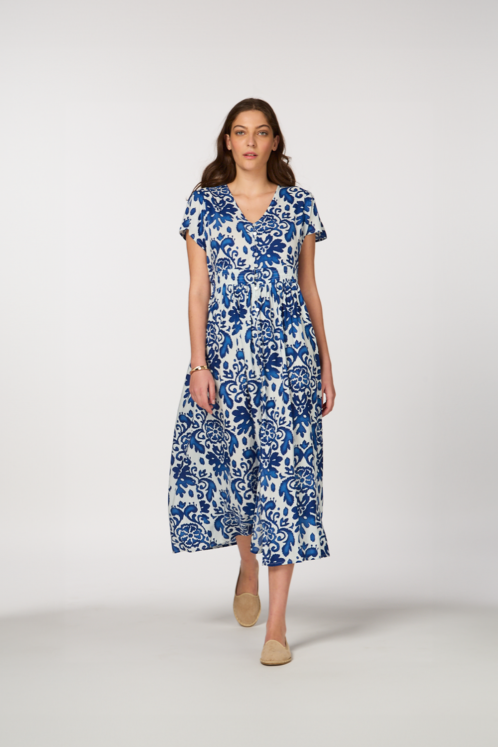 • Blue paisley print midi dress for a classic and sophisticated style
