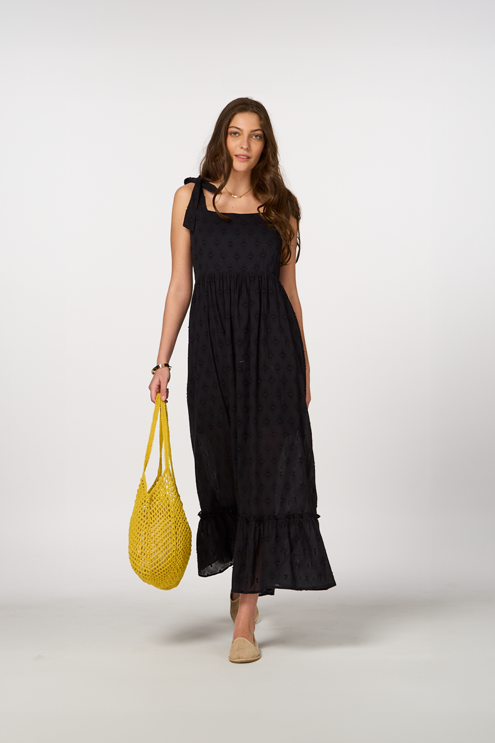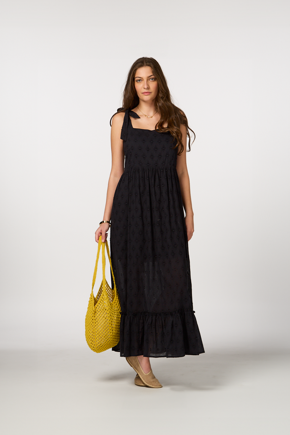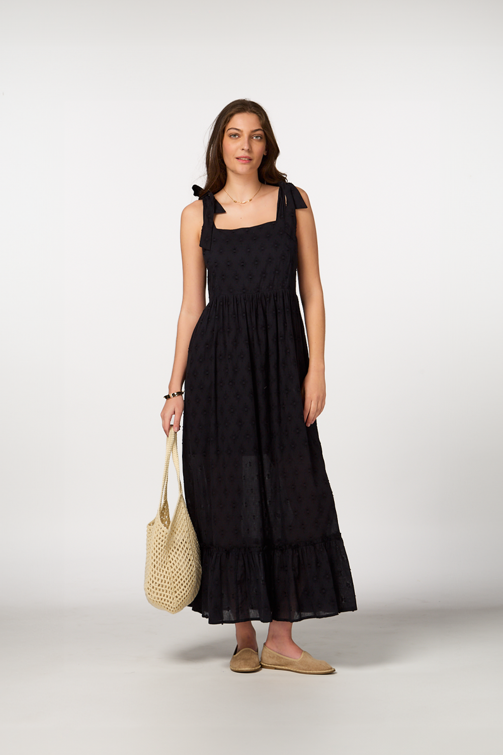 • Black maxi dress with intricate embroidered details for a delicate, elegant look