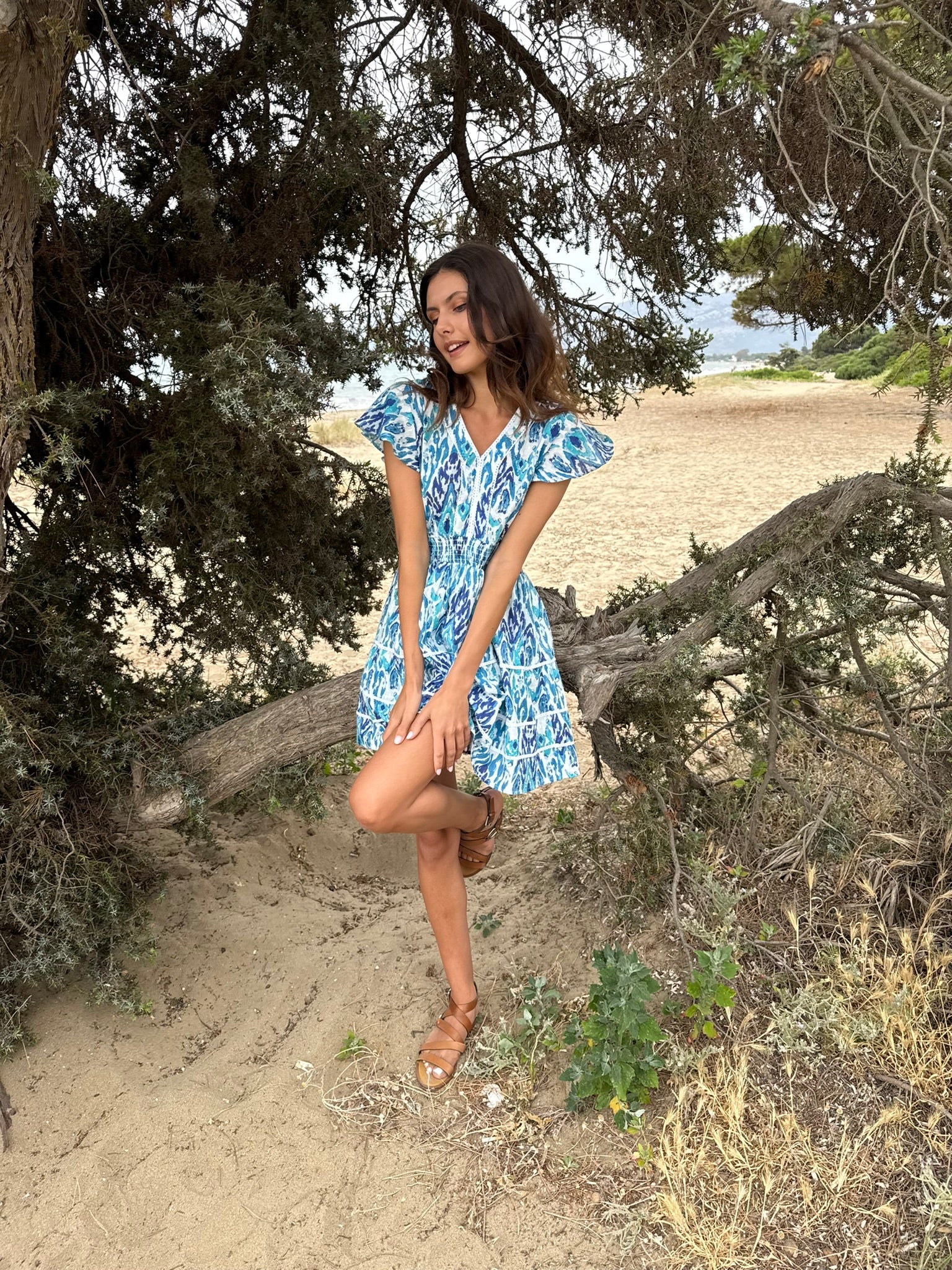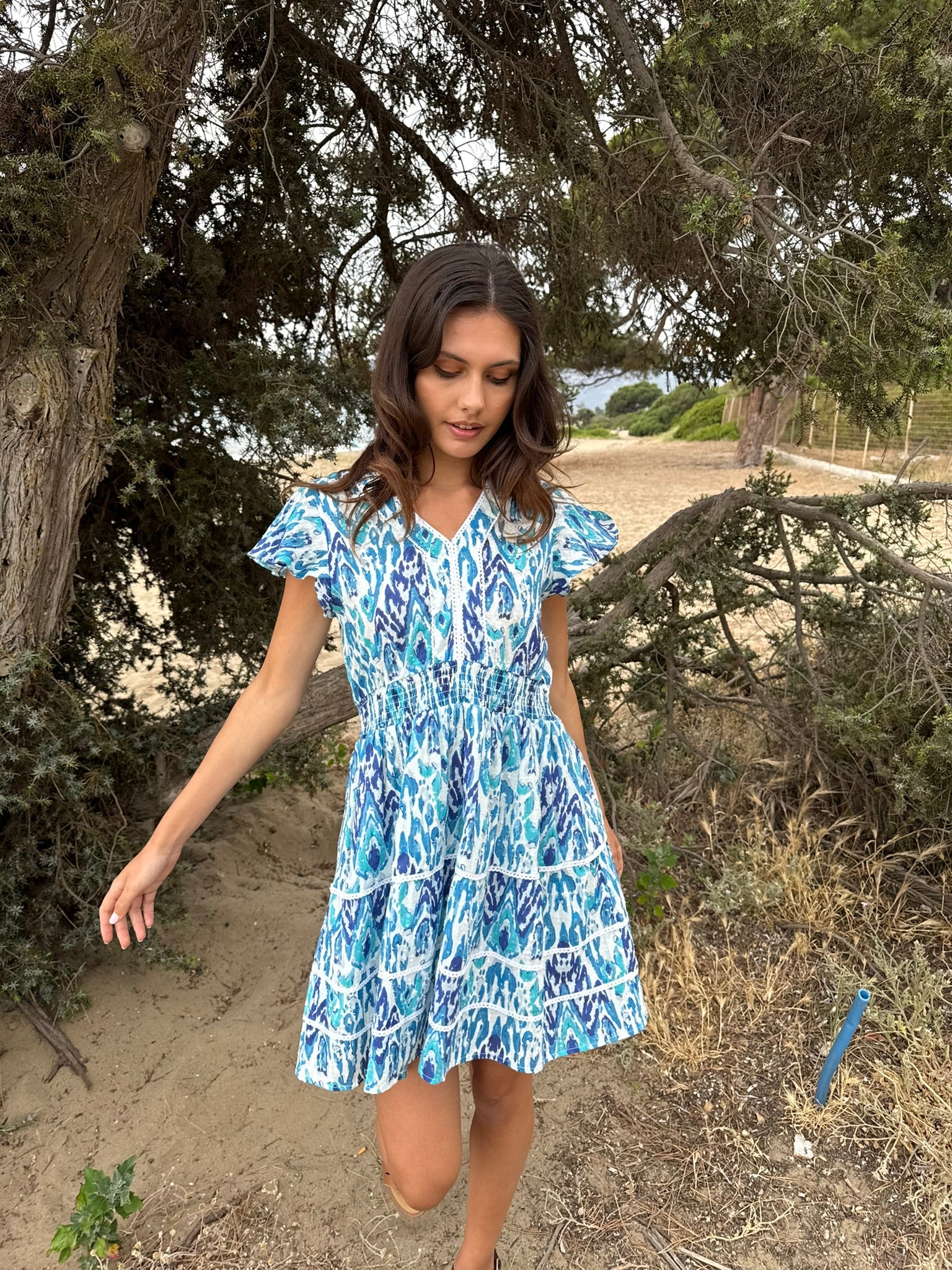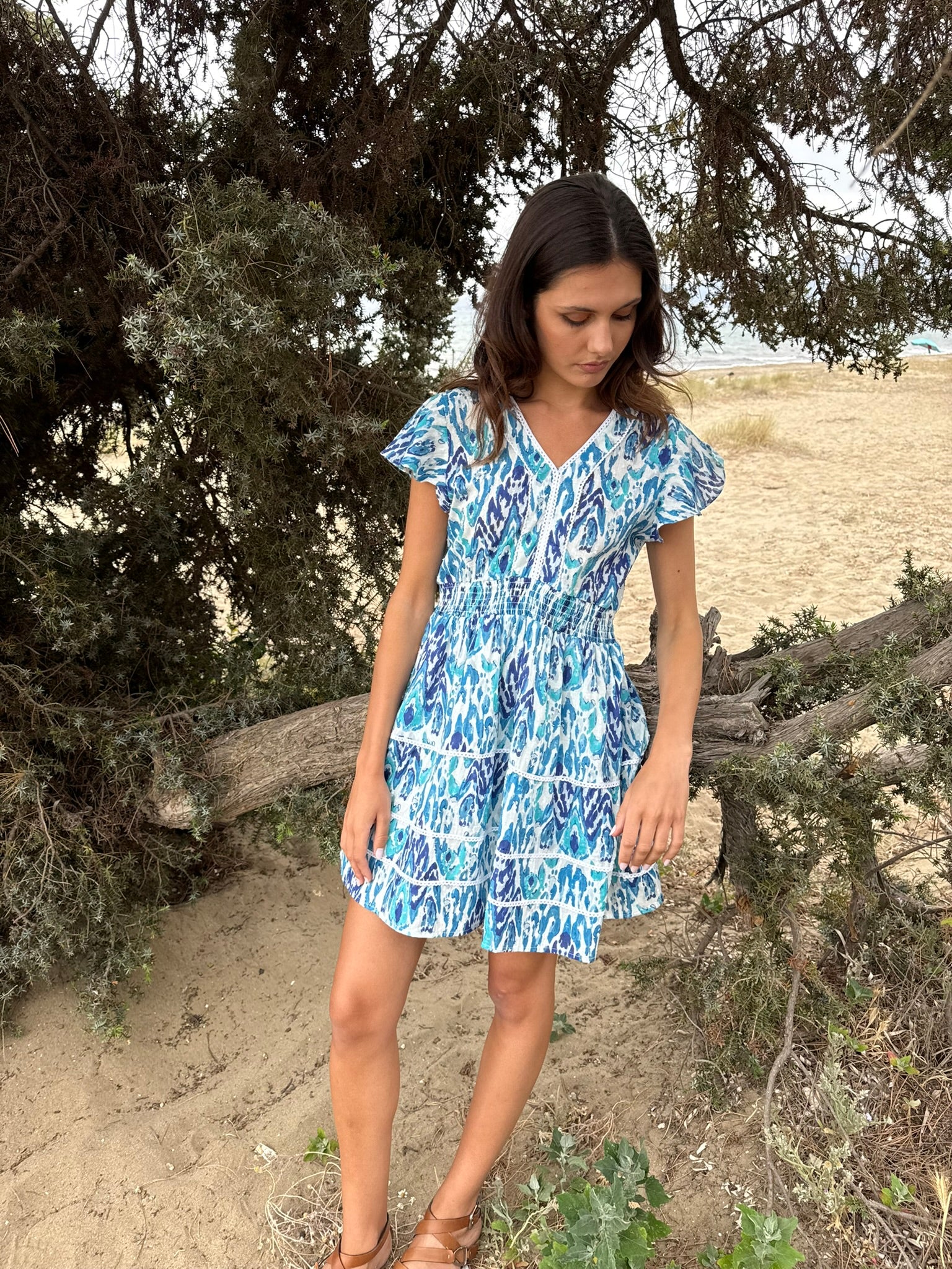 - Sleeveless mini dress in blue shades for a bold and vibrant look