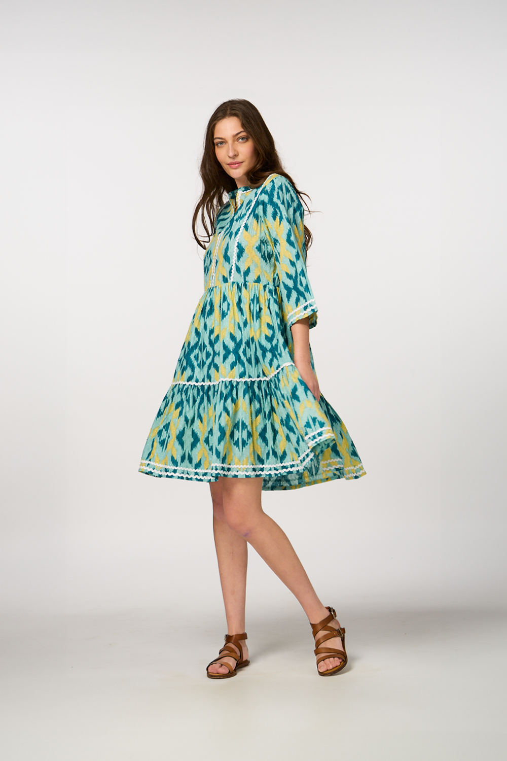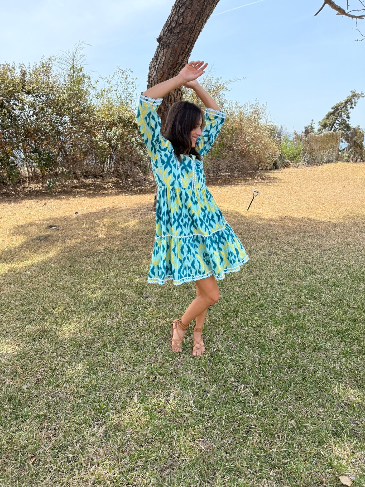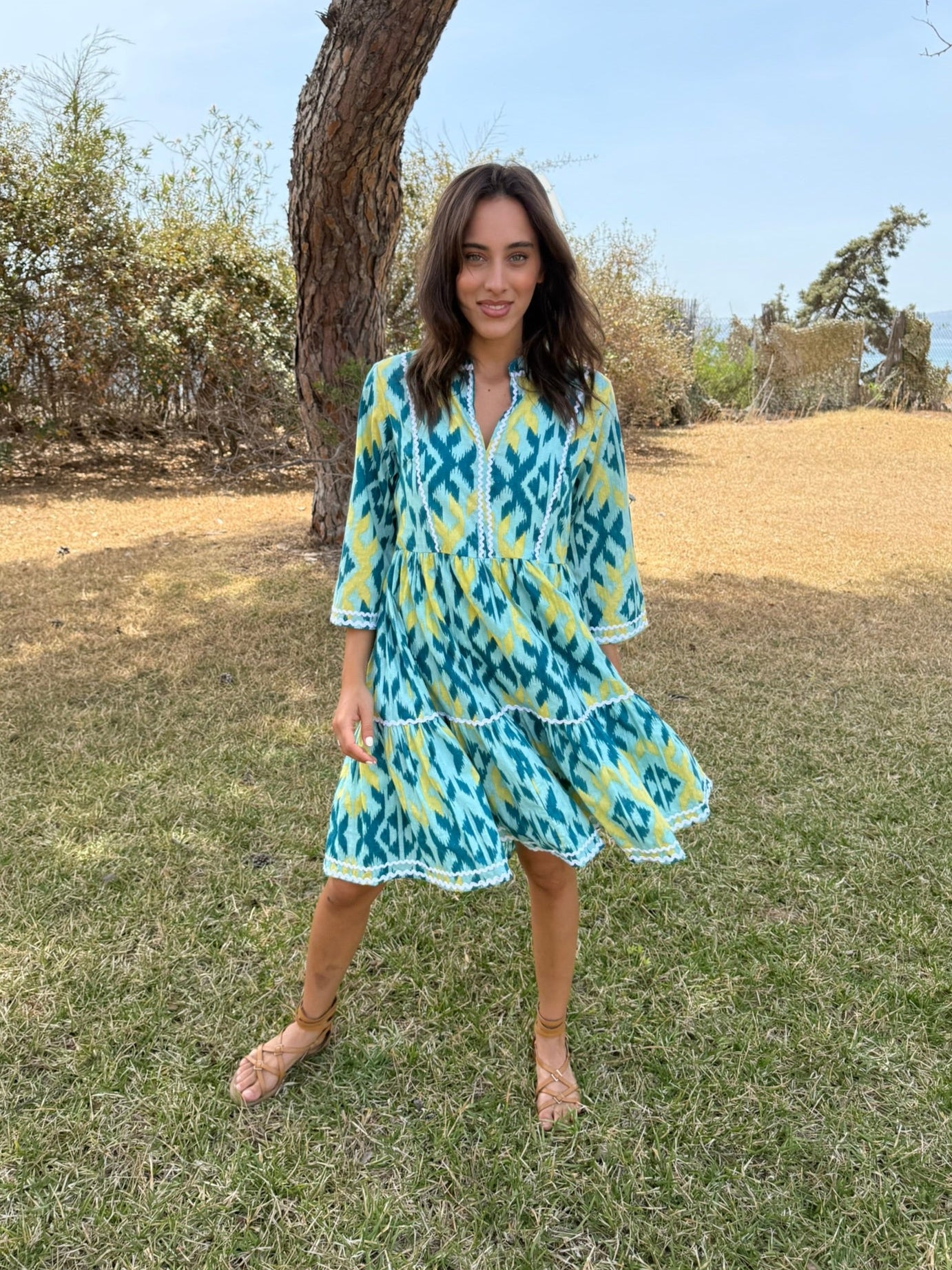 - Mini dress with a bold print in yellow and blue for a vibrant, eye-catching look