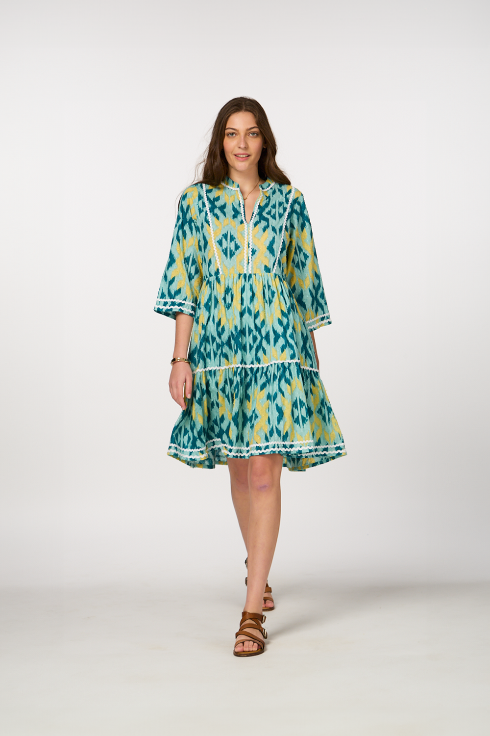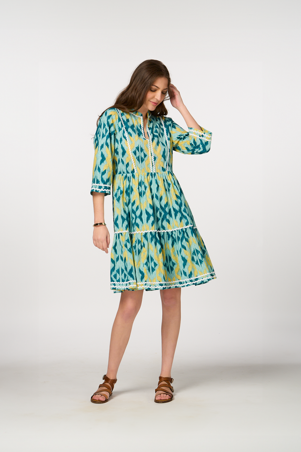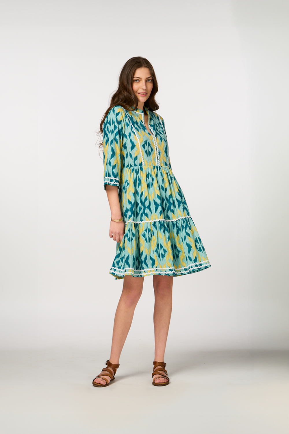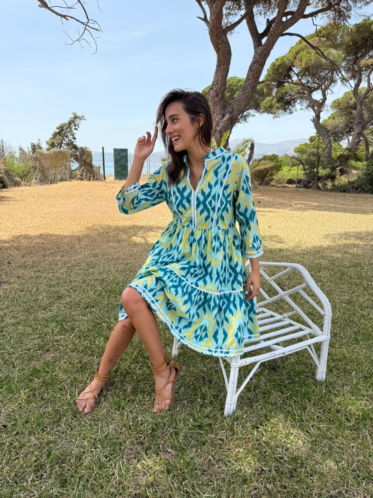 - Mini dress with a bold print in yellow and blue for a vibrant, eye-catching look
