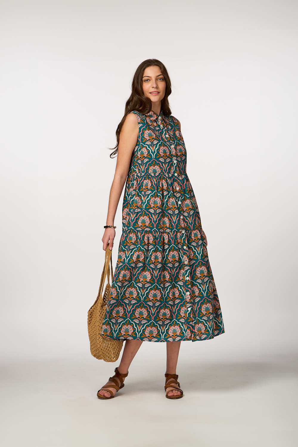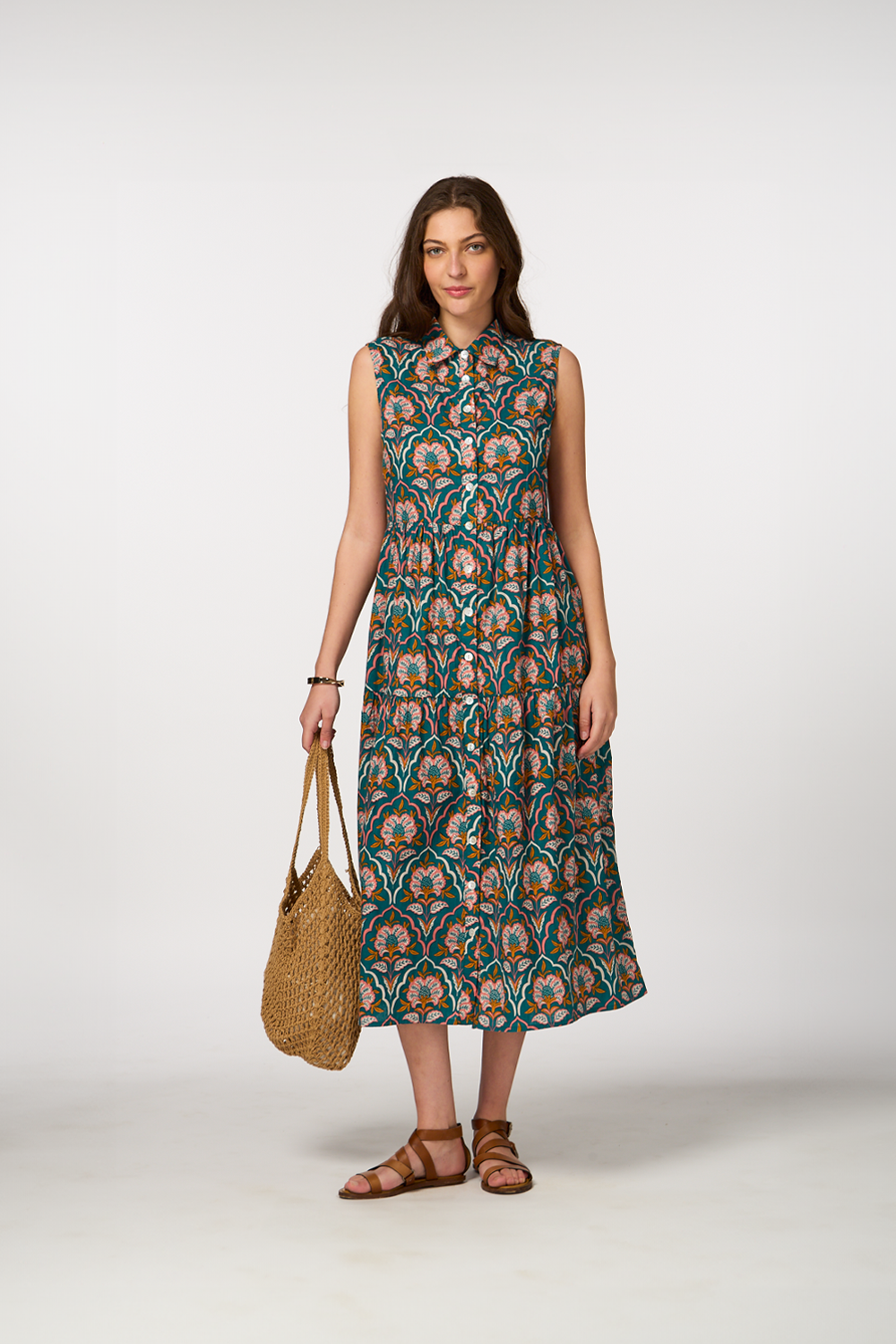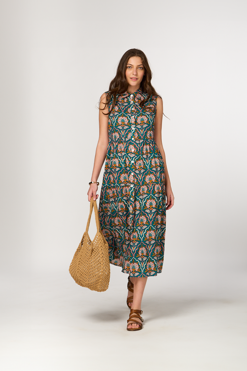 - Maxi dress with buttons and collar for a sophisticated look