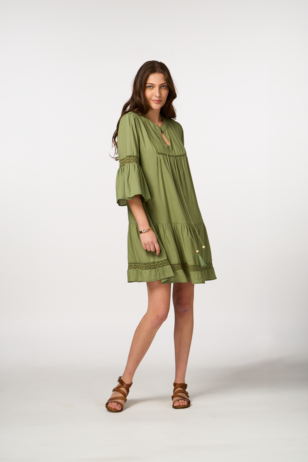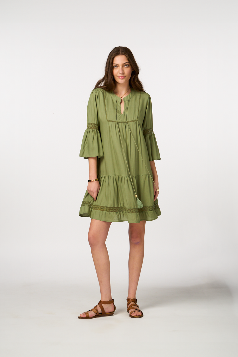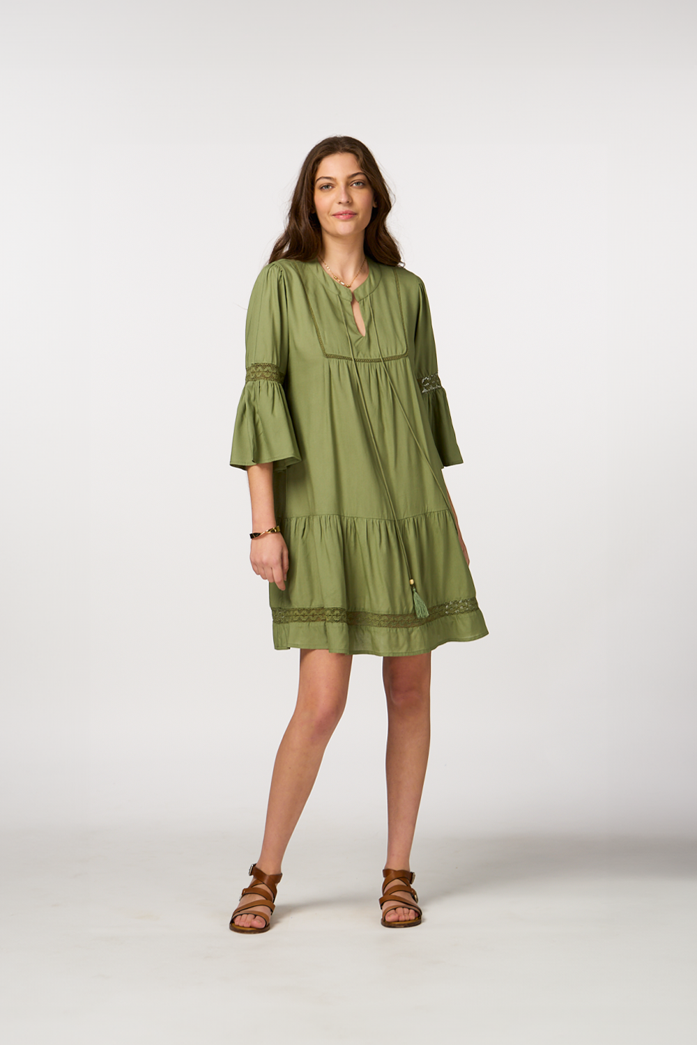 • Mini khaki dress with embroidered details for a stylish and elegant look